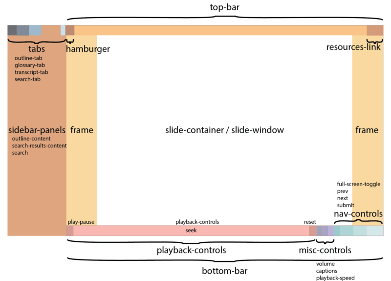 - Articulate Storyline’s structure (the Document Object Model or DOM) limits us to five main areas: top-bar, bottom-bar, sidebar-panels, tabs, and frame.
